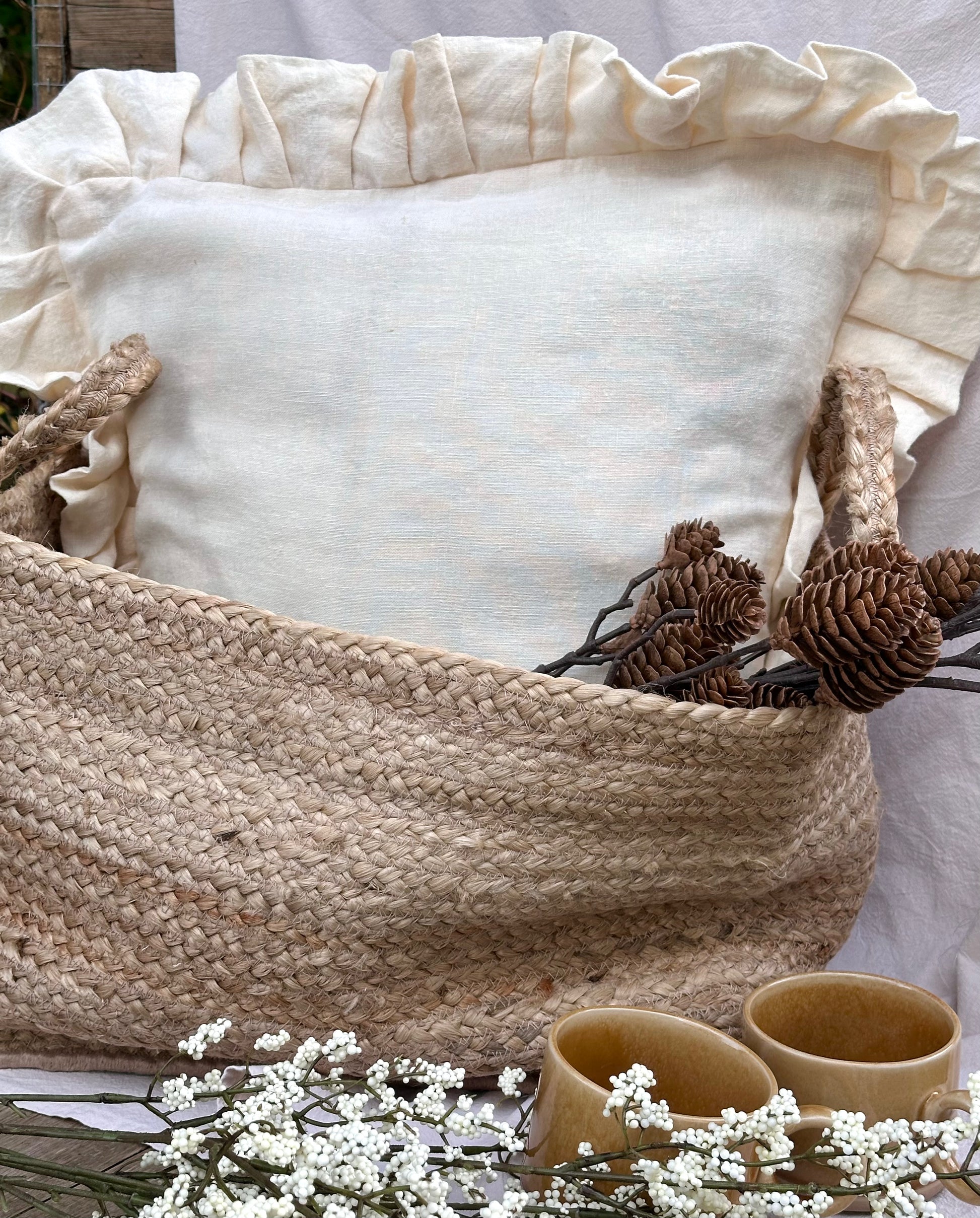 The luxurious linen fabric offers both comfort and texture, while the delicate, ruffled boarder adds a charming detail. Perfect for creating a cosy and inviting atmosphere, this cushion complements a variety of decor styles from rustic to modern. It's neutral tone makes it versatile, seamlessly fitting into living rooms, bedrooms, or cosy reading nooks. Ideal for those seeking subtle elegance and a relaxed timeless appeal.