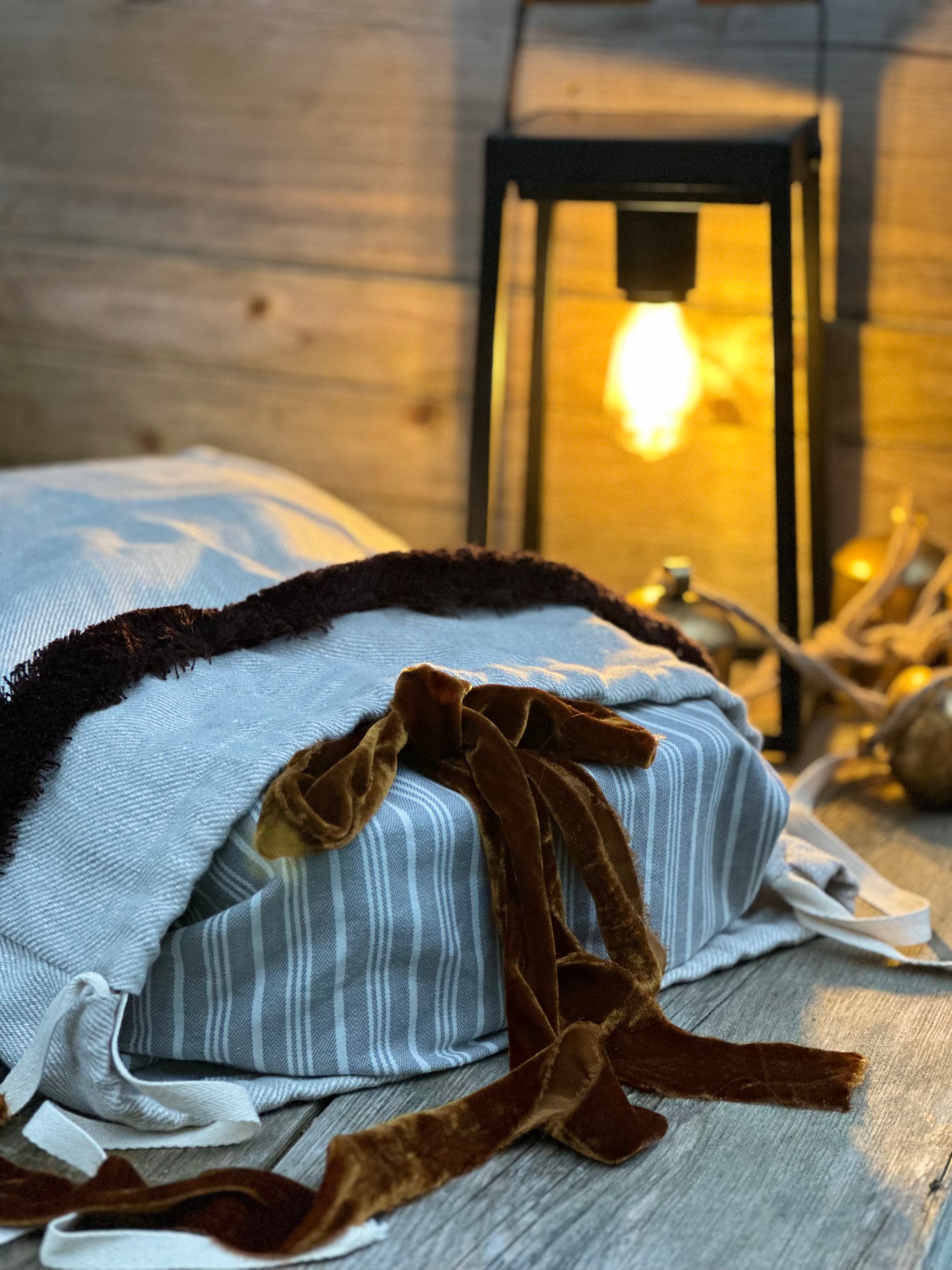 Elevate your holiday gifting with this beautifully handcrafted festive sack, perfect for presenting larger gifts or using as a charming holiday decor. Made from a soft, neutral line twill fabric and finished with cosy fringe trim, this sack brings a warm, rustic touch to your celebrations.