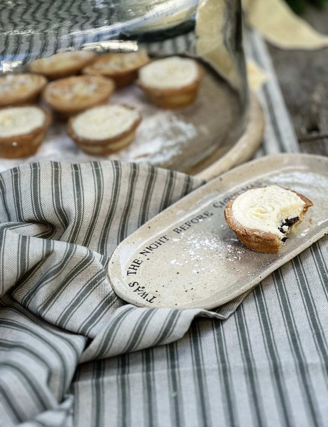 Featuring a classic, vertical stripe pattern in a neutral palette with soft muted olive and beige tones, makes it ideal for any gathering, whether it's a casual brunch to a more intimate dinner.