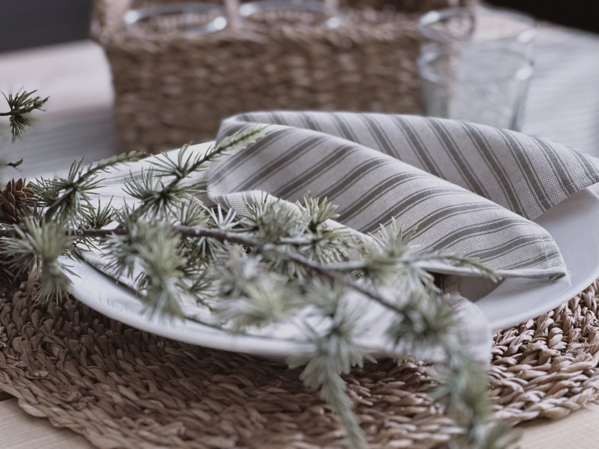 The Bodmin napkins exude a calm, earthy vibe, perfect for creating a cosy, inviting atmosphere.The soft olive and beige tones create a neutral palette and work well with other tableware with natural textures, placed with delicate greenery bringing a touch of nature indoors.